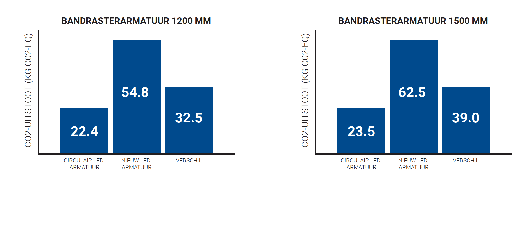Doordat deze onderdelen niet geproduceerd hoeven te worden, wordt tot 65% CO₂-uitstoot bespaard. Concrete cijfers uit onderzoek tonen aan: een bandrasterarmatuur van 1200 mm stoot bij circulariteit slechts 22,4 kg CO₂ uit. Een nieuw armatuur veroorzaakt daarentegen 54,8 kg CO₂-uitstoot. Voor een armatuur van 1500 mm is het verschil nog groter: 23,5 kg versus 62,5 kg CO₂.